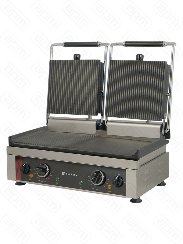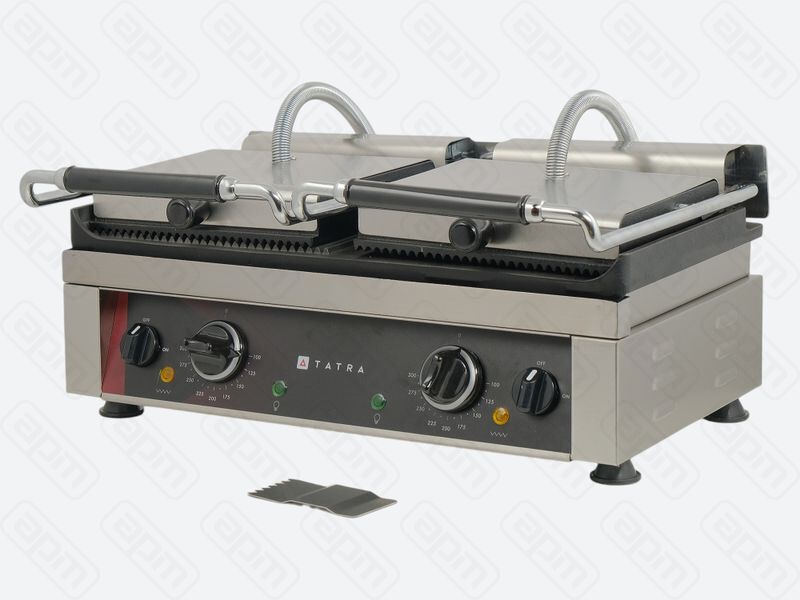 Профессиональный прижимной гриль Tatra TCG 5224 R R R+S предназначен для эффективной обжаривания продуктов (мяса, птицы, рыбы, овощей) и подогрева готовых блюд на кухнях ресторанов, кафе и торговых точек. Обеспечивает высокую производительность благодаря двум независимым нагревательным зонам и возможности регулировки температуры каждой поверхности отдельно.