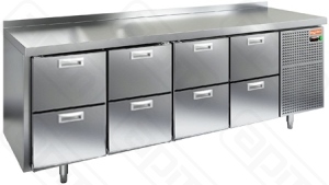 Стол с охлаждаемым шкафом производства HICOLD (Россия), модель GN2222/TN предназначен для использования на профессиональной кухне и сочетает в себе функциональность рабочей поверхности и холодильной камеры. Он используется для приготовления и хранения пищевых полуфабрикатов. Конструкция стола включает в себя стальную столешницу, четырехсекционную холодильную камеру.