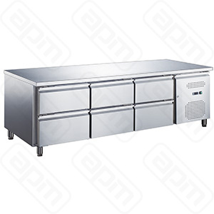 — Температурный режим -2/+8 — Динамическое охлаждение — Столешница из нержавеющей стали — 6 ящикаов — Боковое расположение холодильного агрегата — Объем: 417л — Регулируемые ножки