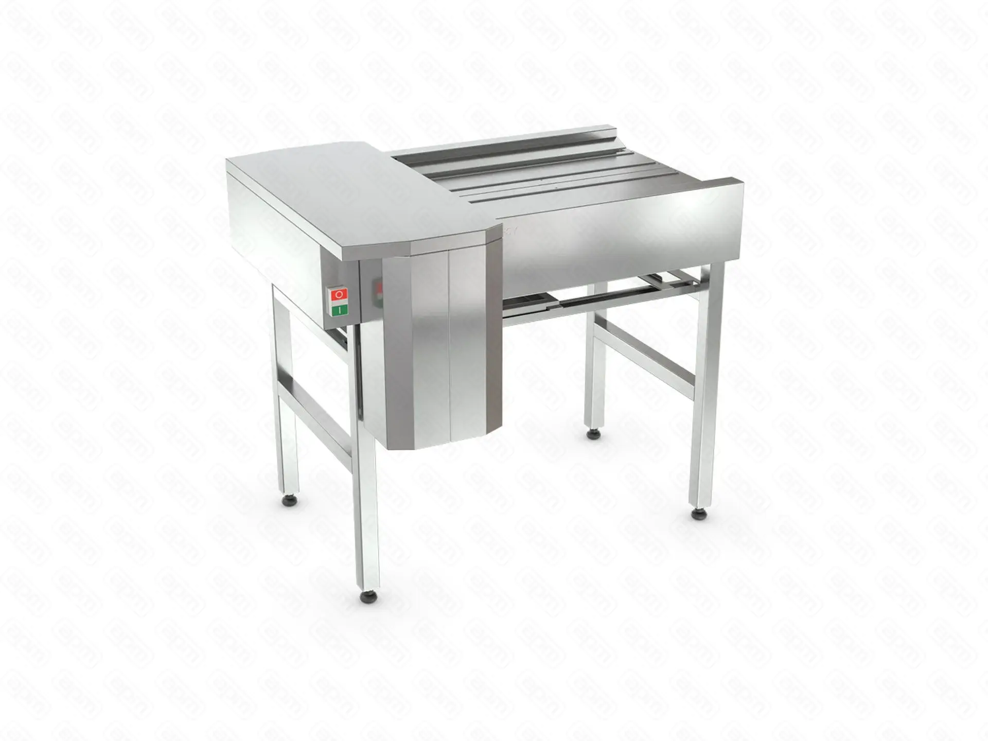 1000х765х880 мм, 0.37 кВт, 380, скорость движения ленты 20 см/с, макс нагрузка на ленту 15 кг/пог.м, ширина ленты 450 мм